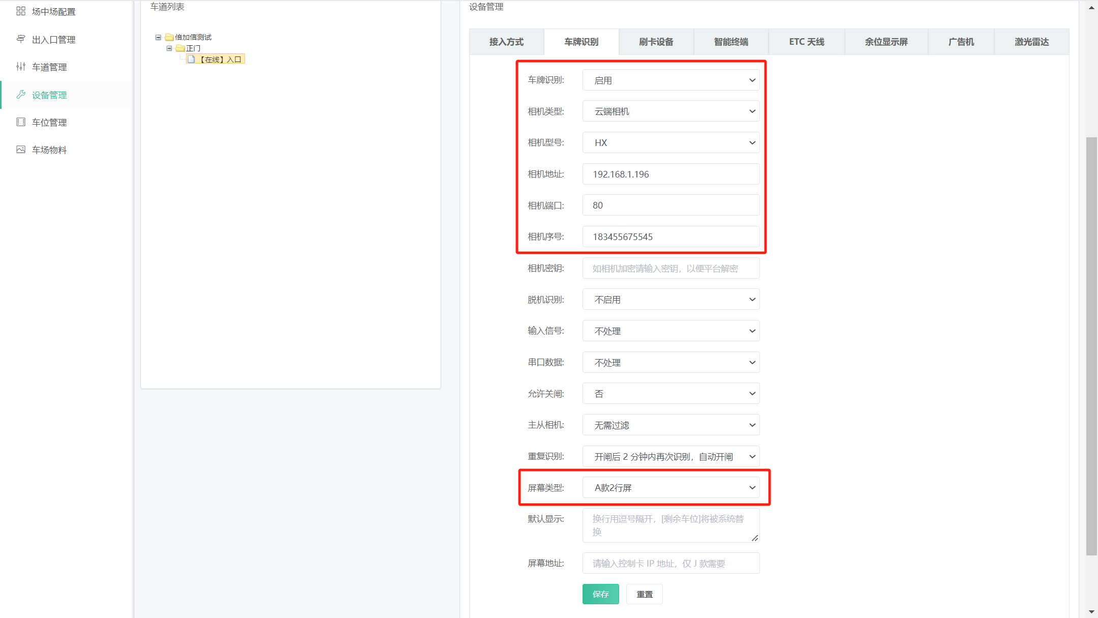 車牌識別,相機選擇云端相機,相機類型選擇HX,相機端口80,相機序號就是設備ID號,屏幕類型根據硬件配置來選擇。