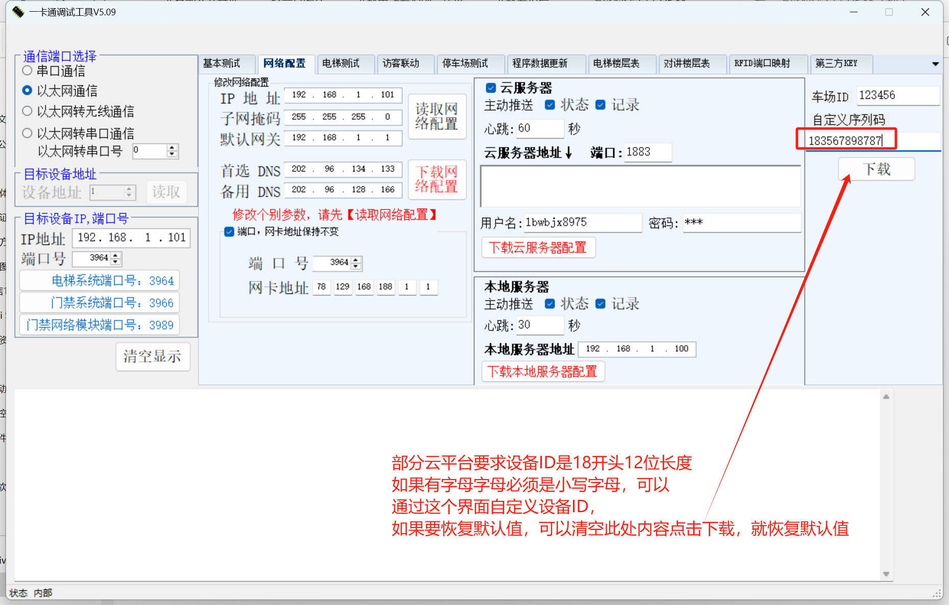 4、倍賀云平臺要求設備ID是18開頭12位長度,如果有字母字母必須是小寫字母,可以通過這個界面自定義設備ID,如果要恢復默認值,可以清空此處內容點擊下載,就恢復默認值。